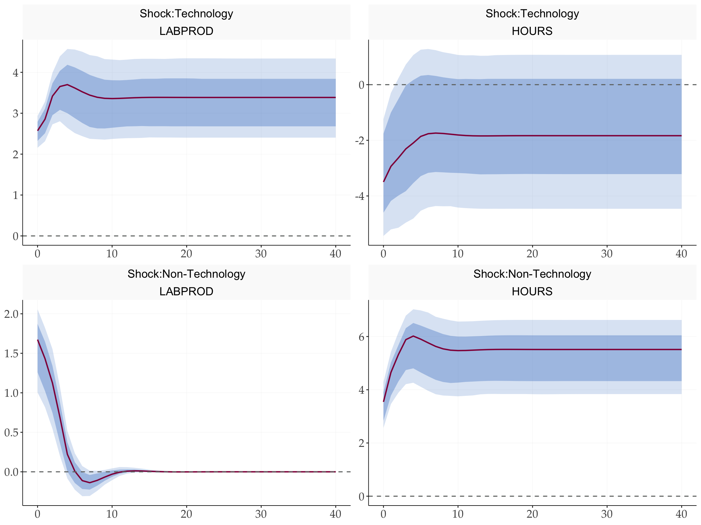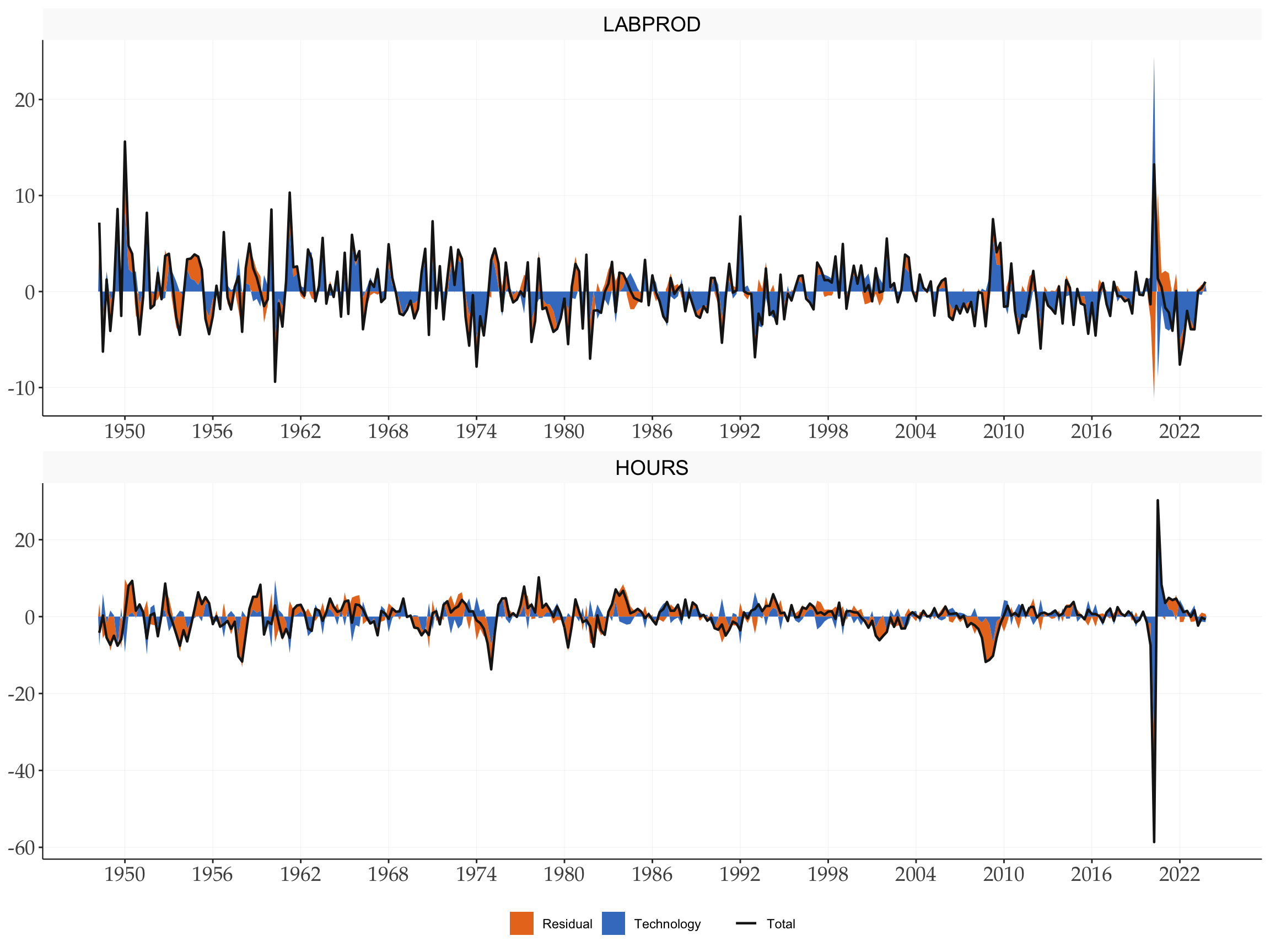 #> Conditional correlation | Non-Technology shock: 0.733Hours and productivity are nearly uncorrelated unconditionally, which sits uncomfortably with standard RBC theory. Once we condition on the source of variation, the picture sharpens: technology improvements are accompanied by a decline in hours, producing a negative conditional correlation. It is the non-technology shock that drives hours and productivity in the same direction — precisely the co-movement that RBC models mistakenly ascribed to technology.